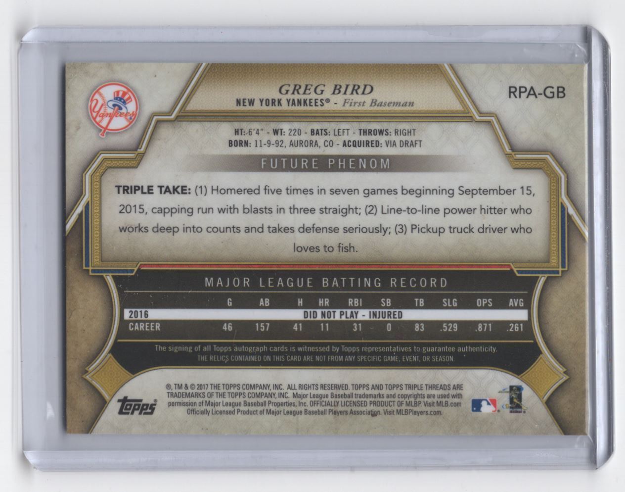 | 2017 Topps Triple Threads Rookie and Future Phenom Autographed Relics 21/35 RPA-GB Greg Bird Onyx |
